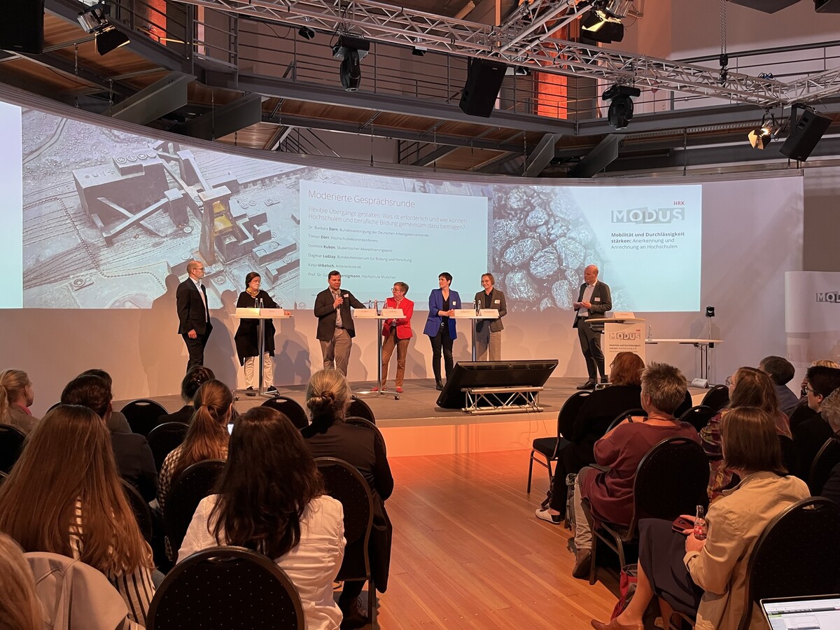 Durchlässigkeit im Bildungssystem zielt darauf ab, Chancengleichheit sowie individuelles Lebenslanges Lernen zu ermöglichen. Dazu dient die Schaffung wechselseitiger Übergänge zwischen Bildungsbereichen, insbesondere zwischen der beruflichen und der hochschulischen Bildung. Über Bedingungen, Herausforderungen und mögliche Ansätze für beidseitige Durchlässigkeit tauschten sich rund 150 Interessierte und Expert:innen aus dem hochschulischen und dem beruflichen Sektor auf der zweitägigen Konferenz des HRK-Projekts MODUS am 23. und 24. Mai 2023 auf der Zeche Zollverein in Essen aus.